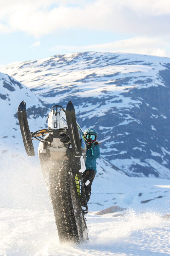 “ Min start är ganska lik Jockes, fortsätter Angelica, även jag har växt upp med skoter inom familjen. Jag har två äldre bröder som också älskar att köra skoter och jag kommer så tydligt ihåg när de köpte sina första maskiner och fick börja köra skoter helt på egen hand, när jag då var tvungen att sitta bakom mamma och pappa på deras skoter var ledsamt. Enda jag hade i tankarna under den tiden var att ta skoterkortet och att en dag köpa min allra första skoter och hänga med grabbarna ut. Då var det bara korta maskiner som var aktuellt. Och när jag väl hade åldern inne och köpte min första maskin, så var det inte så många tjejer inom sporten, och killarna hade lite försprång där. Det var för mig bara att gilla läget och hänga med så gott jag bara kunde. Så kom väl en dag då en av mina bröder köpte en längre “lössnö” maskin. Vi alla skrattade åt honom och skämtade, vad ska du göra med den där? Men det tog inte lång stund innan vi insåg att den här typen av maskin öppnade upp en helt ny värld av skoterkörning. År 2014 var året då alla köpte varsin långa maskin och det tog oss till nya höjder rent körmässigt. Det var också år 2014 som jag började med att planera, samt anordna skoterevent för enbart tjejer, för att skapa ett större intresse hos tjejer för skoterkörning, något som jag under min start på skoter hade saknat. Planen var att skapa event där folk kunde känna sig trygga och hitta likasinnade människor, men framför allt hitta nya vänner att köra skoter och utvecklas som åkare med. Det här utvecklades vidare och gick under namnet Skyhigh Riding, ett samlingsnamn som min bror skapat för oss som åkt tillsammans genom vår uppväxt, men också namnet skulle förknippa olika typer av event dom bygger på god sammanhållning, där alla skall känna sig välkomna och målet att få dela vår stora skoterpassion med. När jag och Jocke sedan flyttade till Vilhelmina, för att både komma hem samt komma närmare fjällvärlden, började samarbetet med Edvard på Vilhelmina Motorcenter där jag under en längre tid var ambassadör. Nu när vi “tar över” stafettpinnen är målet lite densamma, sprida vår passion för sporten och se till att alla känner sig välkomna, vi kommer såklart fortsätta med event och tiden framför oss är något vi ser väldigt mycket fram emot..”