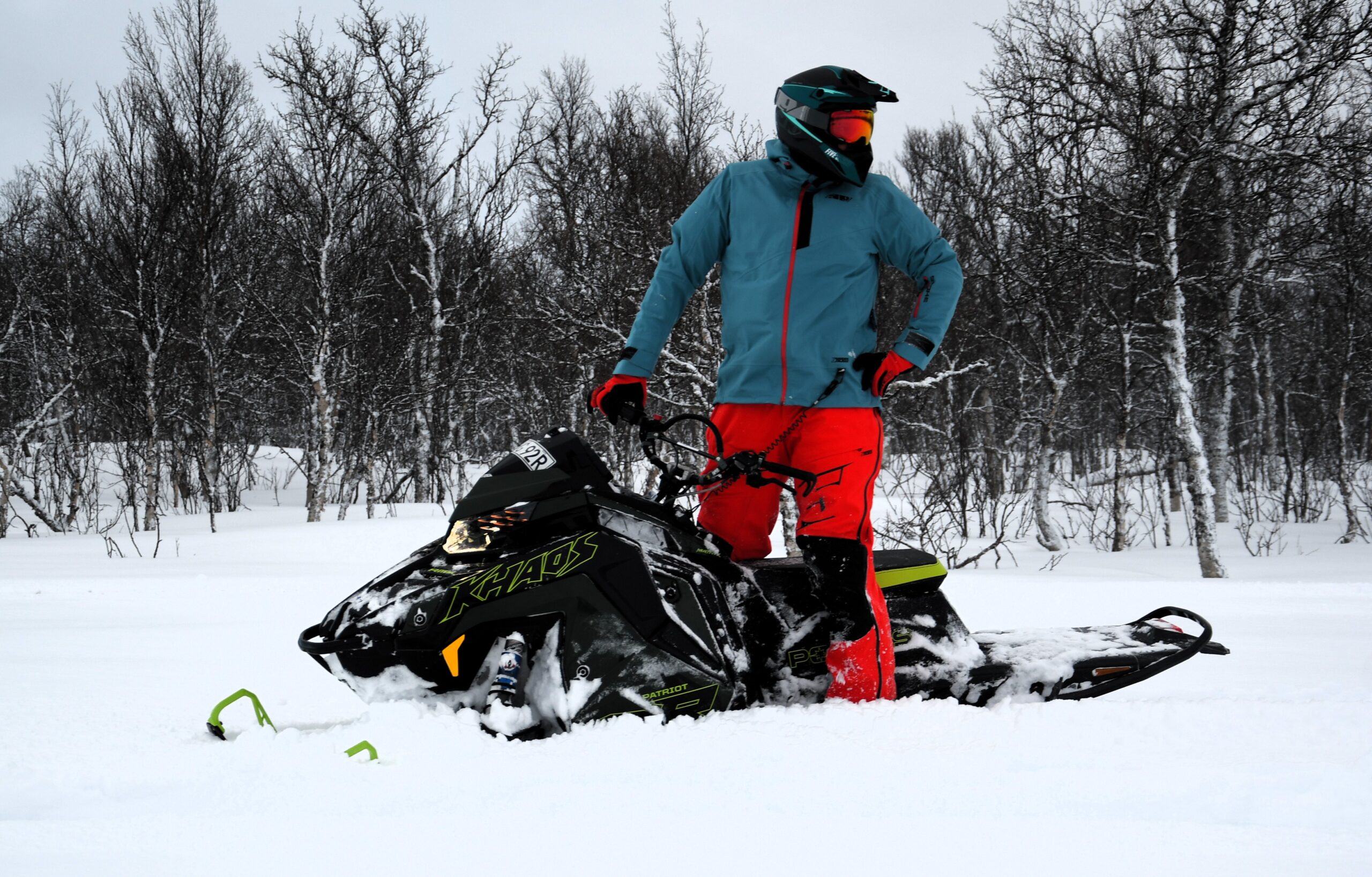 Kronan på verket. Eller åtminstone högst upp på gubben, denna kolfiberhjälm och skitsnygga gogglar. En snygg och hyfsat lätt hjälm med väldigt bra passform. Satt verkligen som en keps på huvudet och skalets utformning med ett ganska långt käkskydd tilltalade mig mycket. Gillar inte om hjälmen kommer för nära underkäken. Föredrar att ha god marginal mellan hjälm och ansikte, om man skulle få en riktig snyting mot huvudet.High-Flow systemet ger en välventilerad hjälm. Faktiskt nästan för välventilerad för vinterbruk. Personligen kör jag alltid med balaclava under hjälmen, men trots det så drabbades jag nästan av ”hjärnfrost” vid några tillfällen. Dock gjorde de medföljande skydden för ventilationsöppningarna susen. När det var som kallast blev dessa skillnaden mellan en fruktansvärd resa och en behaglig färd. Utandningsskyddet är klockrent och passar perfekt mot Aviator 2.0 gogglarna. Foamen på gogglarna är ganska stor, vilket ser till att sluta tätt mot ansiktet och hjälmen. Ramen är också rätt stor, men passar perfekt i hjälmens öppning och ger bra sikt. Högsta betyg till hjälm och gogglar.